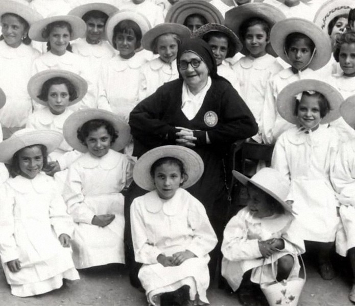 A Beata Elena Aiello em meio a alunas de sua obra.(Fonte: Vincenzo Speziale, ‘Suor Elena Aiello Profeta di Dio ‒ Vita, opere e scritti della venerabile madre’, Reverdito Edizioni, Trento (ISBN 88 7978 059 X).