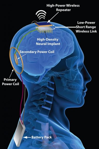 'Os implantes neurais, também chamados de implantes de cérebro, são dispositivos médicos projetados para serem colocados sob o crânio, na superfície do cérebro. Muitas vezes tão pequenas como uma aspirina, os implantes utilizam eletrodos finos de metal para ‘escutar’ a atividade cerebral e, em alguns casos, estimular a atividade no cérebro. Atendidos à atividade entre os neurônios, um implante neural pode essencialmente ‘escutar’ a atividade do cérebro e depois ‘falar’ diretamente ao seu cérebro.' (Cérebros biológicos e além - Wall Street Journal)