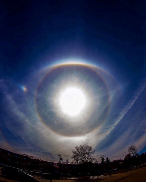 Justin Oertel descreve sua foto no Instagram: ‘Eye in the Sky’. Confira esta incrível foto que tirei ontem à tarde em Brandon, Manitoba, Canadá, de um enorme e brilhante Halo solar que lembra um olho.