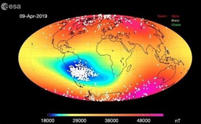 A ESA usa três satélites para acompanhar mudanças no campo magnético da Terra. A animação abaixo mostra a anomalia entre abril de 2014 até agosto de 2019. Os pontos brancos no mapa indicam momentos em que os satélites detectaram radiação maior, concentrando-se no sul da América do Sul.