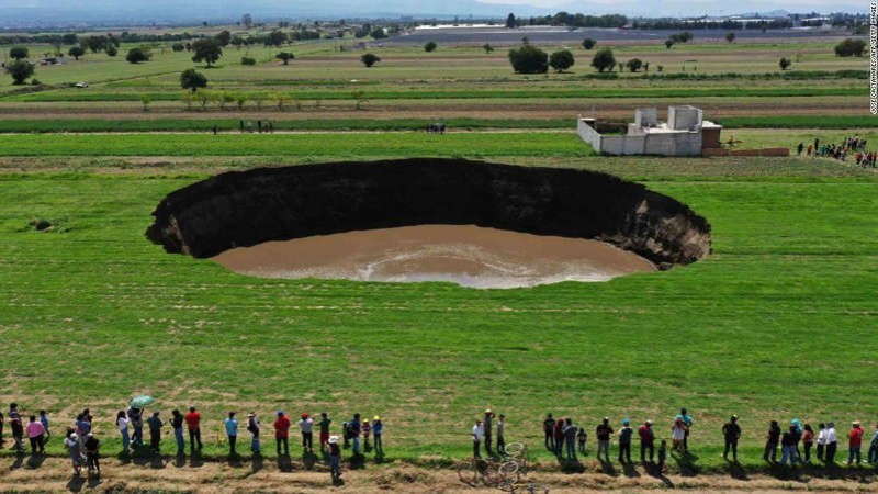 Um enorme buraco de cerca de 60 metros de diâmetro apareceu nos campos dos agricultores no centro do México, ameaçando engolir uma casa próxima.