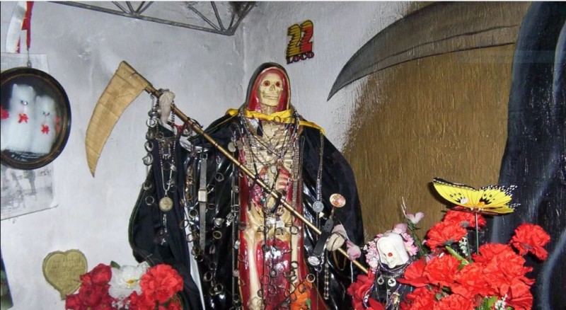 El personaje resulta del cruce entre la parca y la Virgen de Guadalupe, patrona de México, viste una túnica blanca y a menudo se la puede ver empuñando una guadaña y un globo terráqueo. Este supuesto ‘santo’ es el preferido entre muchos grupos de narcotraficantes de origen mexicano y centroamericano quienes han logrado crear un movimiento religioso importante, rezándole muchas veces a diario y pidiendo protección, riquezas y el ‘silencio’ para poder encubrir sus delitos.