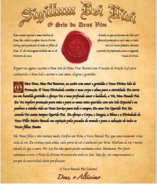 Proteção contra os inimigos: “Minha querida e amada filha, Eu devo informar-te que uma terceira guerra mundial está prestes a desenrolar-se no mundo. O Segundo Selo está prestes a manifestar-se como foi previsto pelo Evangelista João no Livro do Apocalipse. Por causa da guerra e da falta de dinheiro grande parte da safra será perdida e isso levará à abertura do terceiro selo, o que significa fome. Minha filha, Eu entendo que esta notícia pode ser um choque, mas lembra-te que a oração e o Selo de Proteção do Deus Vivo, Cruzada de Oração (33), protegerá os Meus seguidores. A Minha Igreja Remanescente, vós Meus filhos, sobrevivereis, embora não vá ser fácil. Para tal, recebereis Dons. O Meu presente, o Selo do Deus Vivo, vai tornar-vos invisíveis para os vossos inimigos. Recitai-o todos os dias a partir de agora. Mantende-o perante vós nas vossas casas e abençoai-O por um padre. Começai a vossa preparação rapidamente pois o dia da queda da Europa não está longe” (Jesus, 16/05/2012).