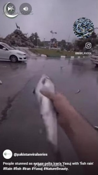 Peixes caíram do céu durante uma tempestade no Irã. Especialistas explicam o fenômeno incomum dizendo que, se uma tromba d’água ou tornado passar sobre a superfície de um corpo d’água, ele pega sapos, caranguejos ou peixes pequenos e os eleva a uma grande altura. O redemoinho carrega os habitantes do mar por longas distâncias, onde eles caem junto com a chuva.